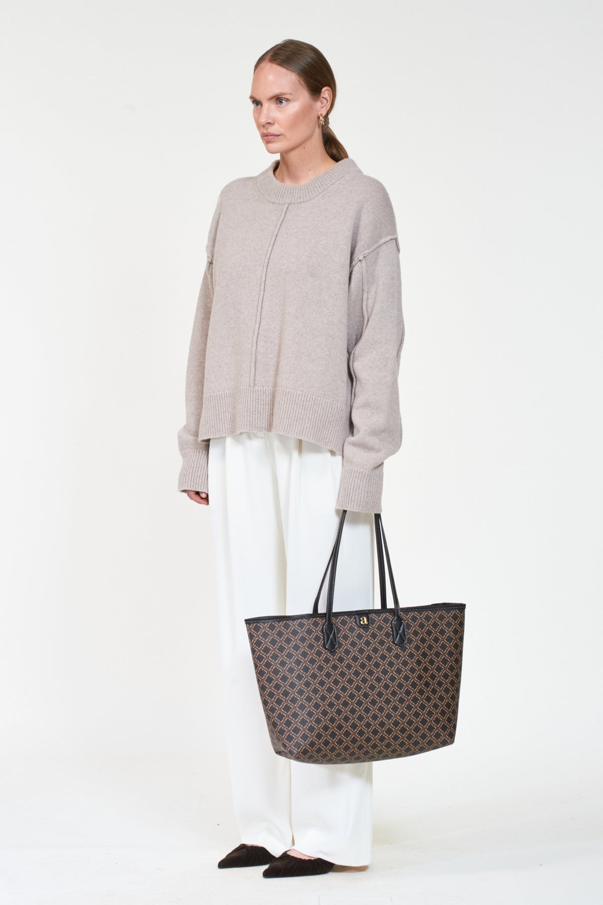 "Ultimate Monogram Tote" fra Arnie Says. Ultimate Monogram Tote er en romslig og tidløs tote bag i klassisk design fra Arnie Says. Vesken er laget i slitesterkt materiale med et eksklusivt, all-over monogram i sorte og brune toner. De solide skinnimitasjons-håndtakene og forsterkede sømmene gjør den både praktisk og elegant. Perfekt som hverdagsveske – enten du skal på jobb, reise eller bytur. Den rommer alt du trenger gjennom dagen og løfter ethvert antrekk med sitt stilrene uttrykk.