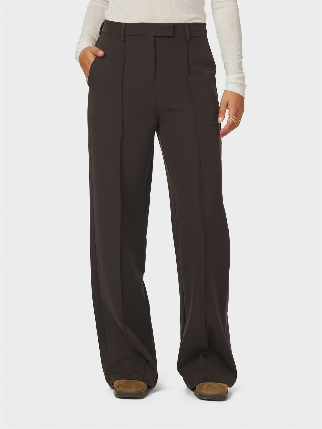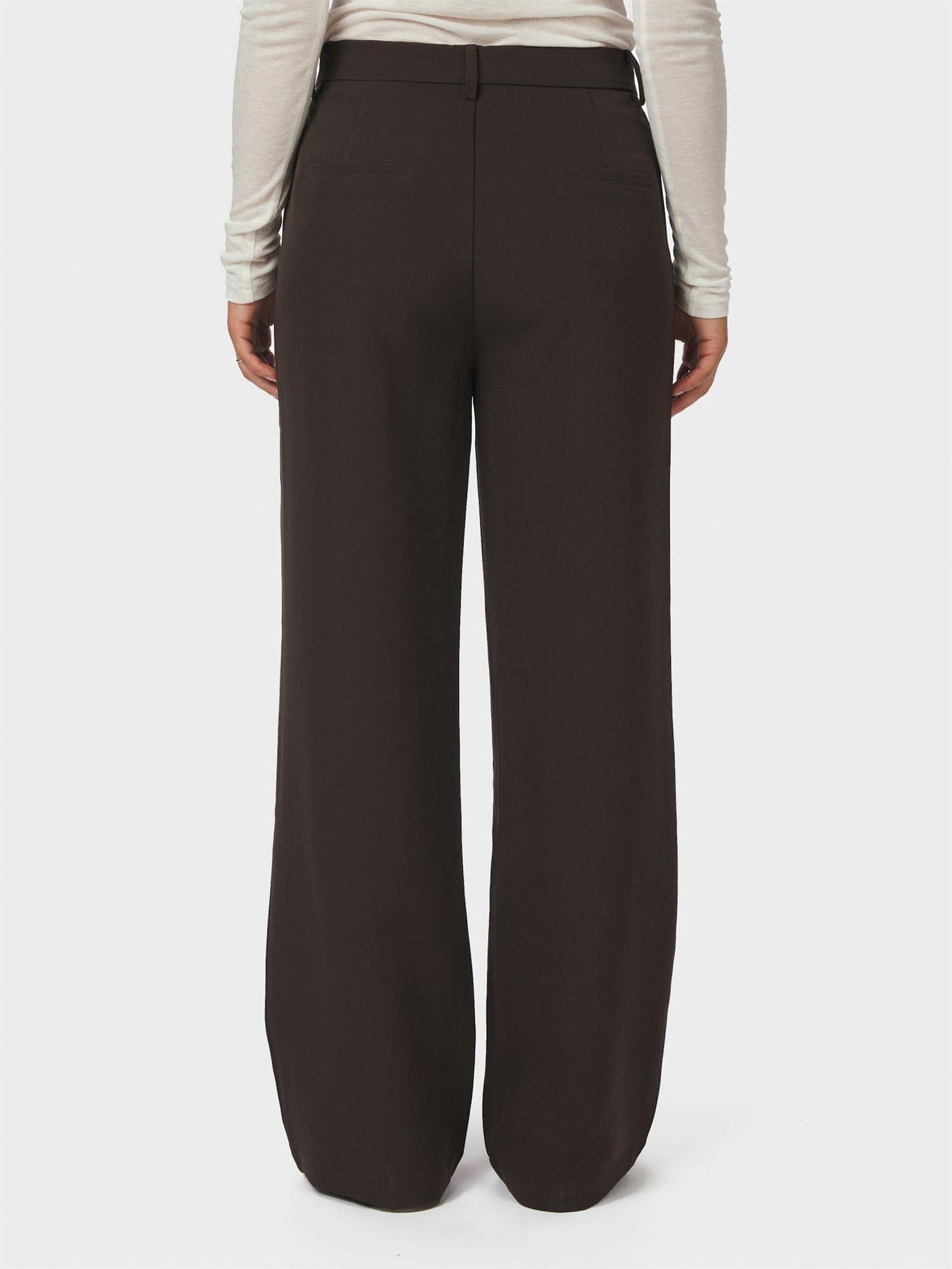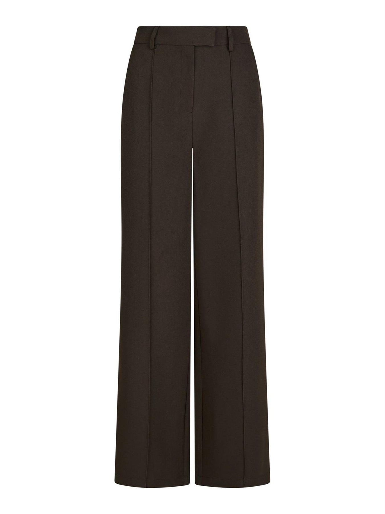 "Sury Suit Pants" fra Neo Noir. En elegant og feminin blondekjole i en dyp sjokoladebrun farge. Kjolen har en smal, kroppsnær passform som fremhever silhuetten. Den er designet med en sofistikert høy hals og lange, transparente blondeermer som gir et delikat uttrykk. Kjolen har en kort lengde med en vakker kamskjellkant nederst, skapt av blondemønsteret. En diskret nøkkelhullsåpning i nakken tilfører en raffinert detalj. Dette er en perfekt kjole for festlige anledninger, som kombinerer klassisk eleganse med et moderne preg.