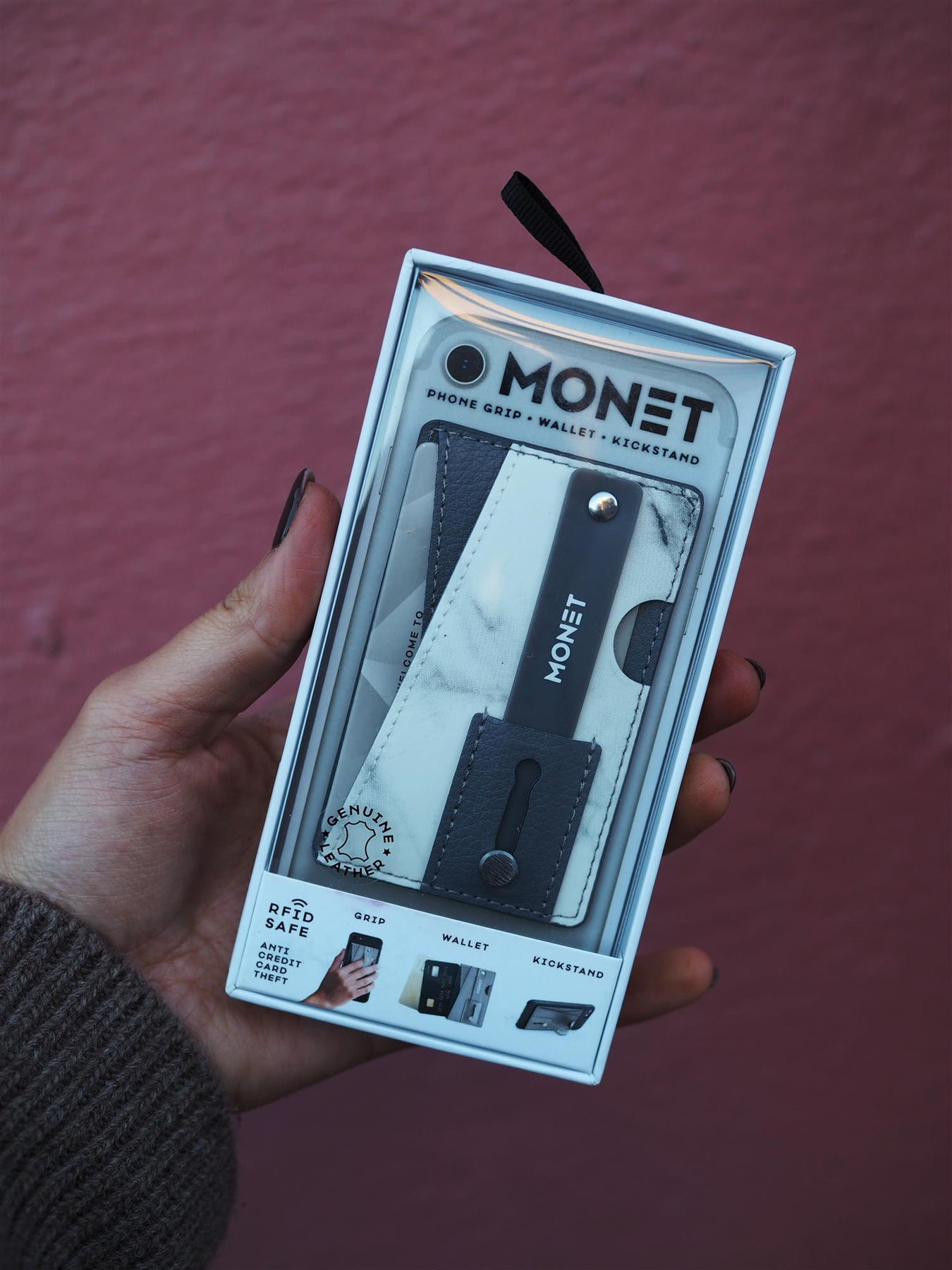 "Monet Grey/White Marble" fra Monet. Smart kortholder med plass til flere kort, som du enkelt fester på mobiltelefonen eller dekslet ditt. Passer til alle deksler og telefoner, og er like dekorativ som praktisk. Den har en funksjonell hank som gjør at dekslet ligger godt i hånden uten at lillefingeren overbelastes. Den smarte hanken fungerer også som en støtte for telefonen din, så den kan stå oppreist når du vil se serier eller lese nyheter på smart-telefonen din. Det aller beste er at den passer til alle telefoner, slik at du kan velge akkurat den typen du liker best. Kortholderen har en stripe med lim på baksiden som gjør at den sitter godt.