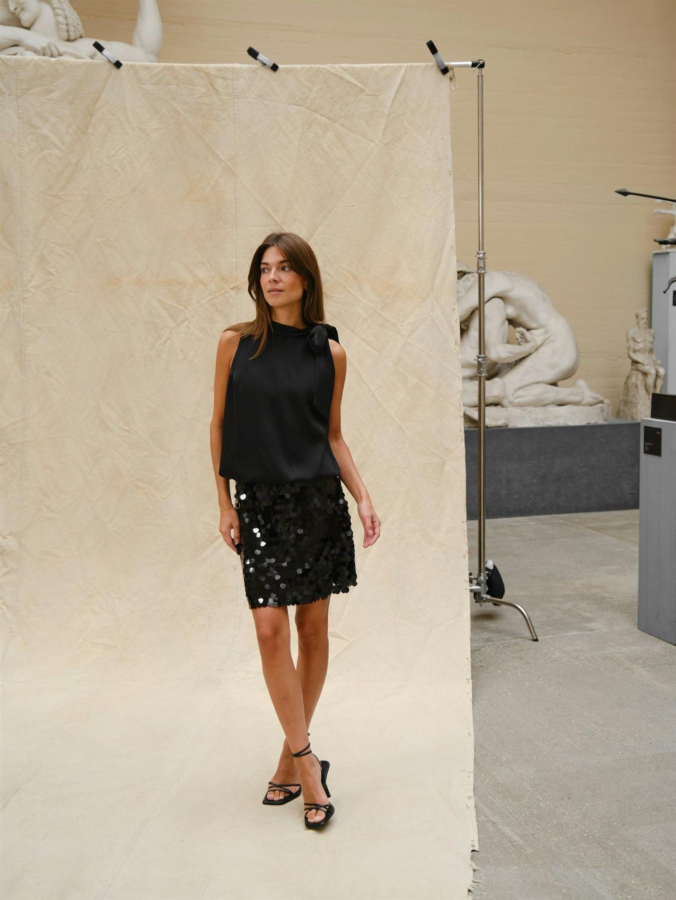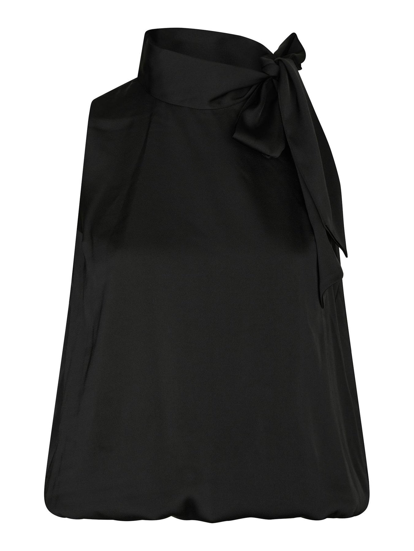 "Veda Drapy Satin Top" fra Neo Noir. Elegant topp fra Neo Noir i sateng. Veda Drapy Satin Top er ermeløs, har høy hals med knytedetalj og en rett passform. Toppen er laget i myk sateng som gir et pyntet uttrykk. Like fin til bukser som skjørt - og perfekt for sesongens festlige anledninger!