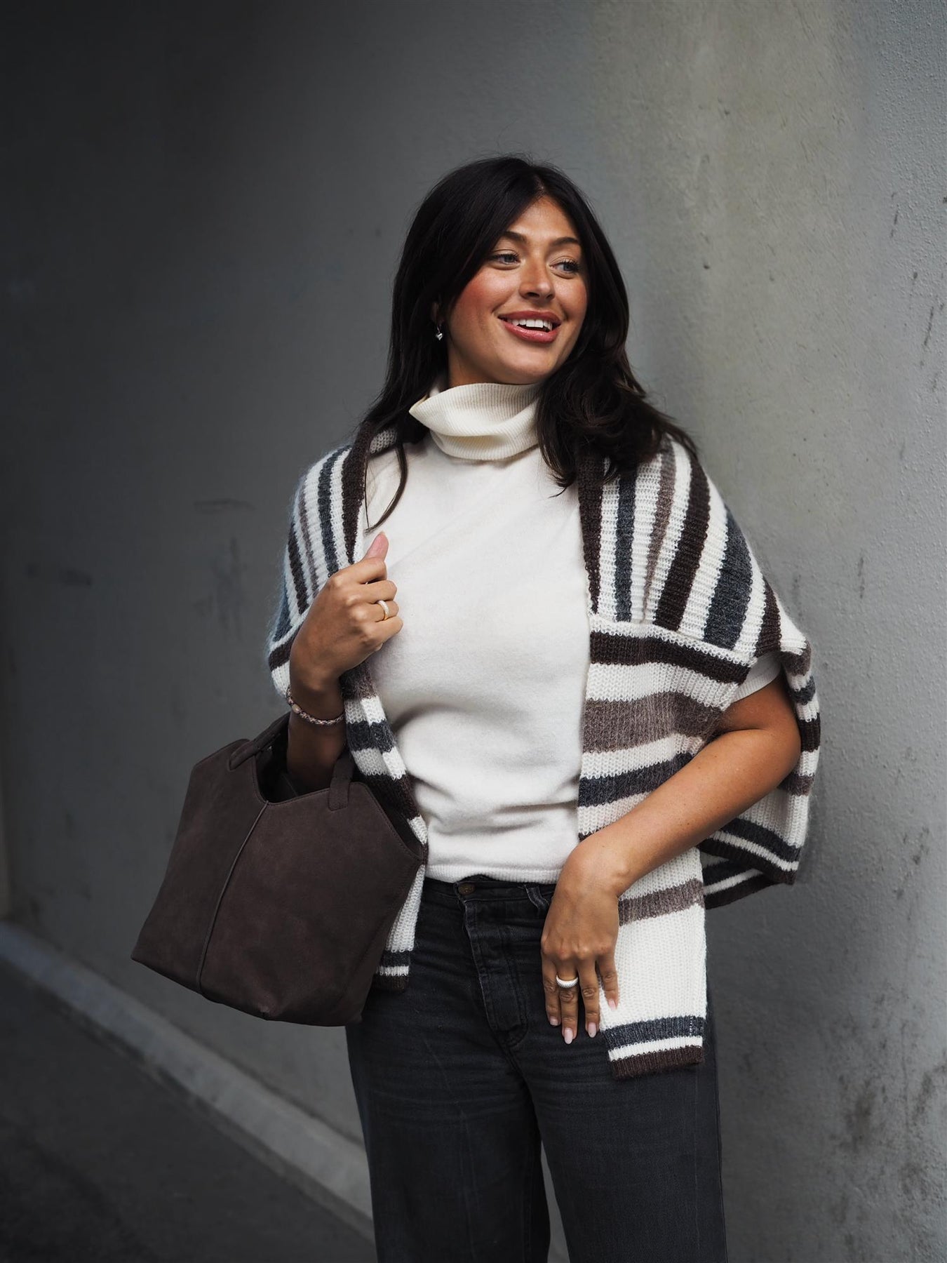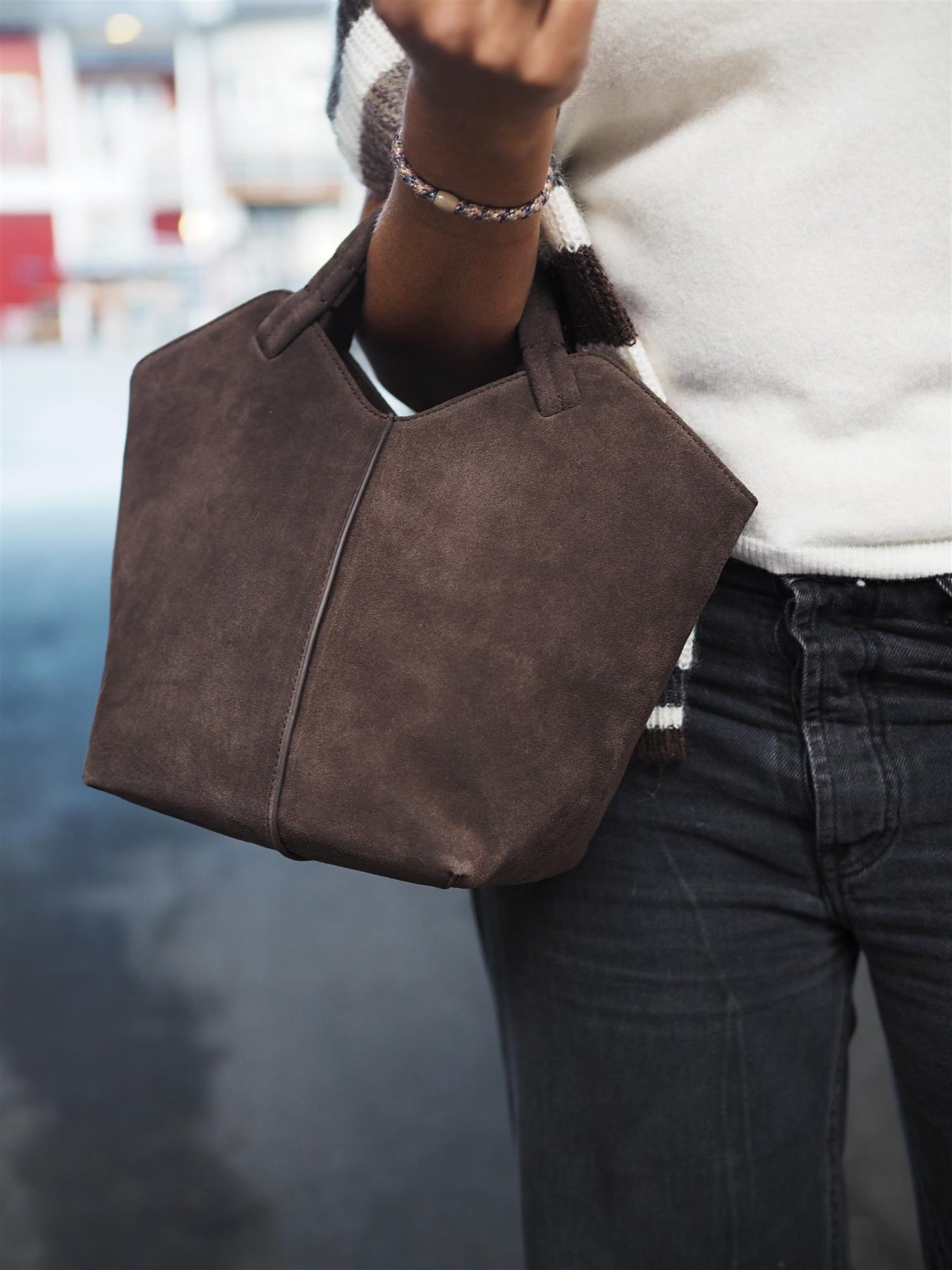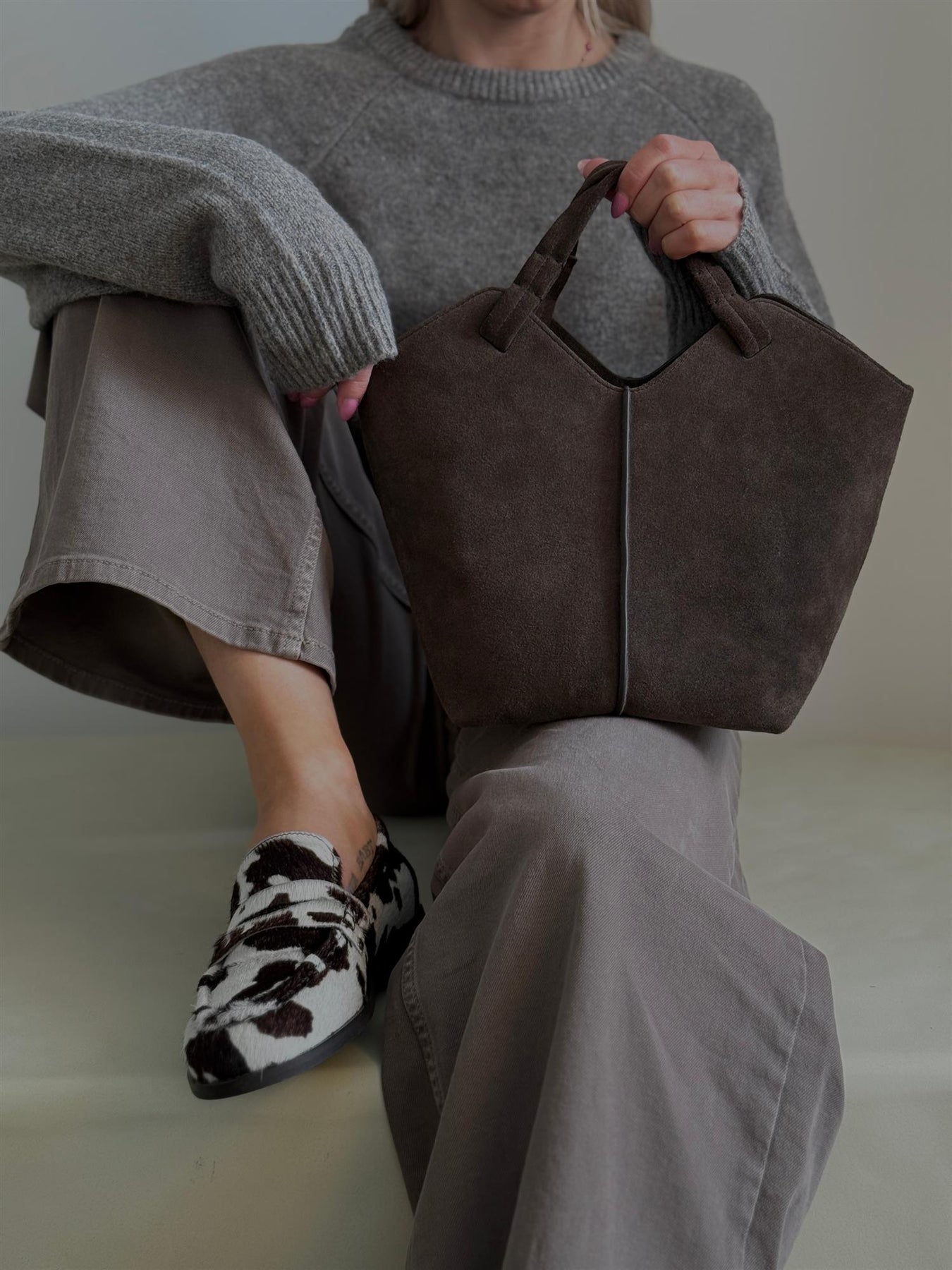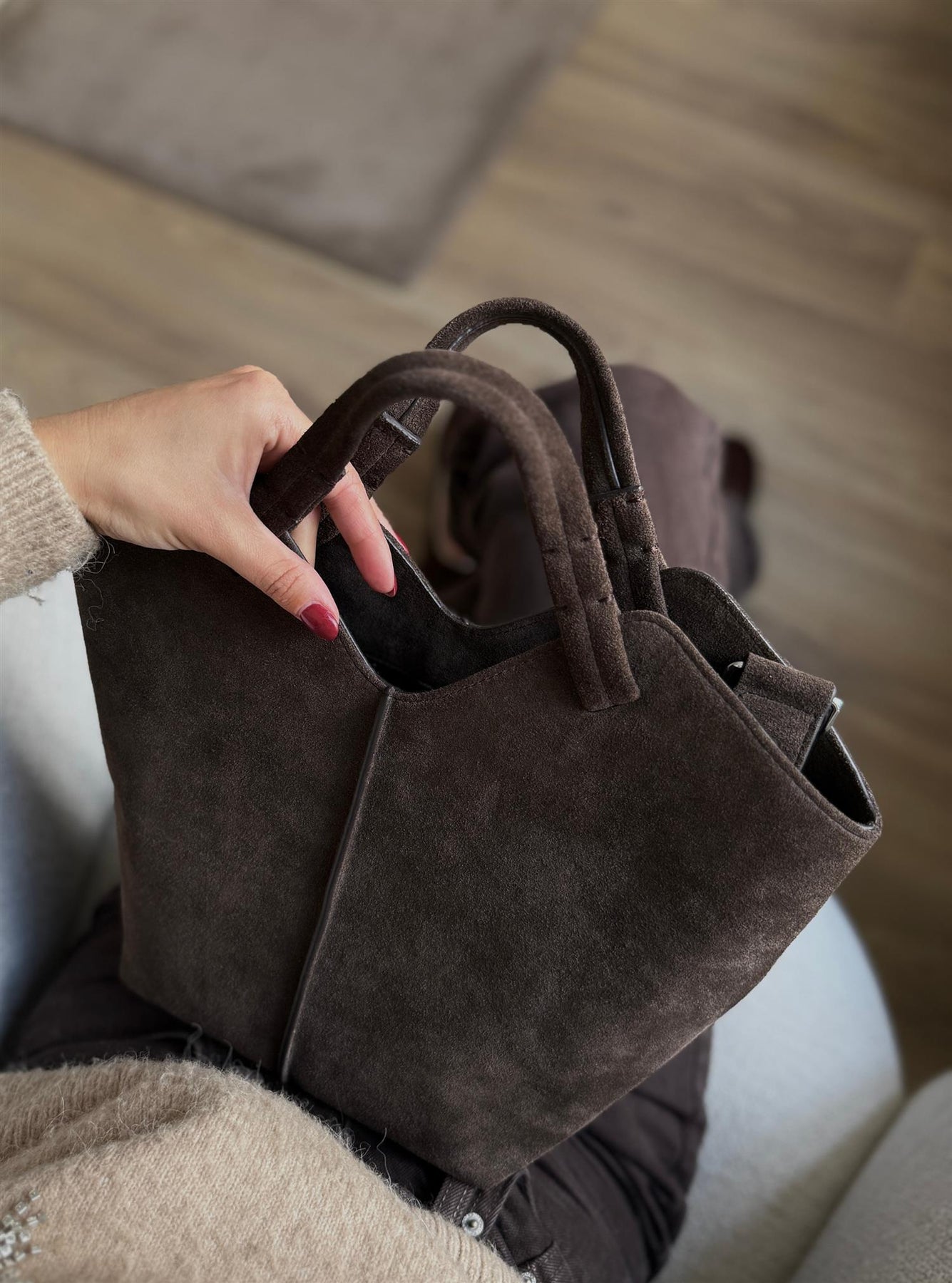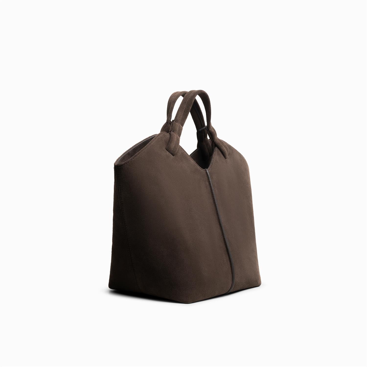"Maya" fra Jim Rickey. En elegant tote-veske i myk, mørkebrun semsket skinn som kombinerer luksus og funksjonalitet. Vesken har et strukturert design med rene linjer, myke håndtak og romslig hovedrom som gjør den perfekt til både hverdagsbruk og reise. Den minimalistiske silhuetten gir en sofistikert look som løfter ethvert antrekk.
