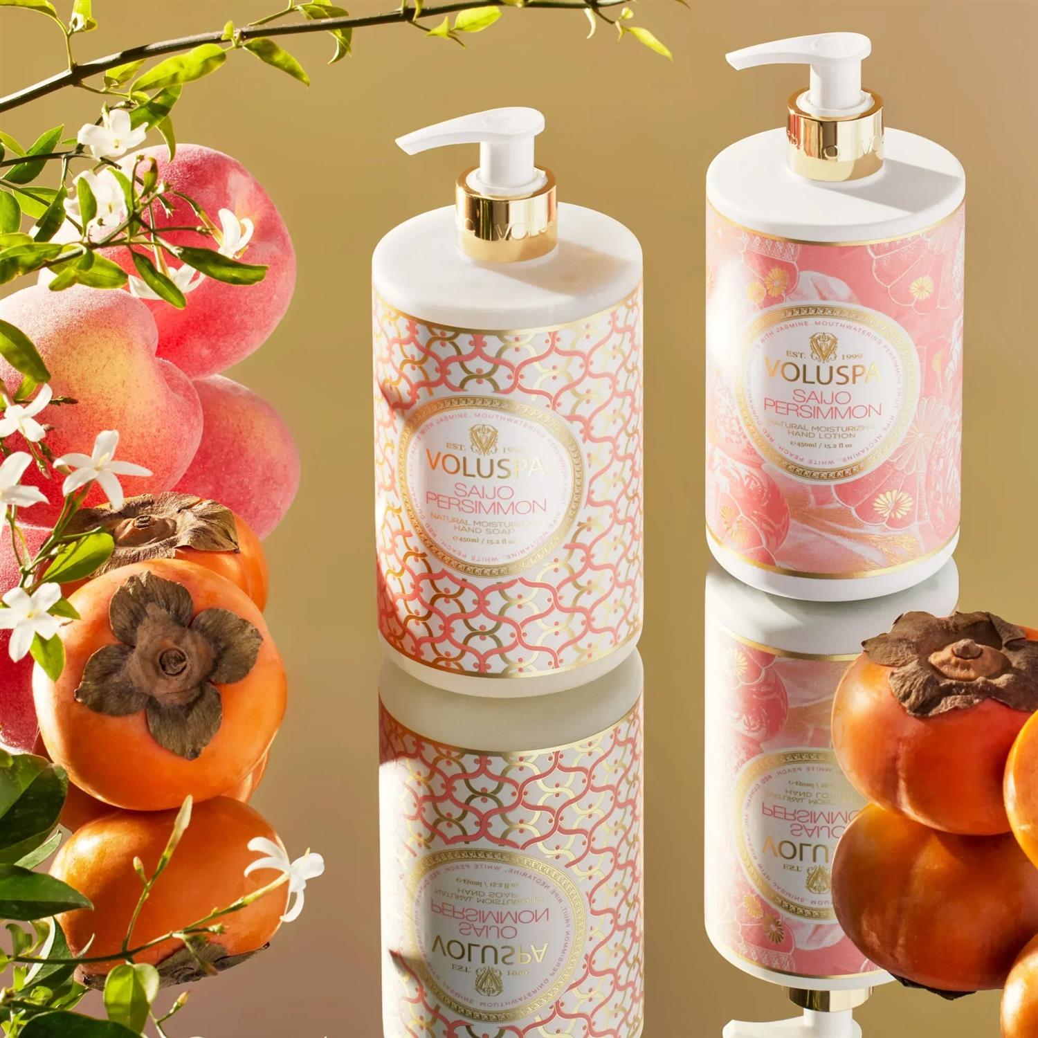 "Hand Wash 450ml Saijo Persimmon" fra Voluspa. Naturlig og fuktgivende håndsåpe med nydelig duft av japansk persimmon, fersken og røde solbær 🍑
