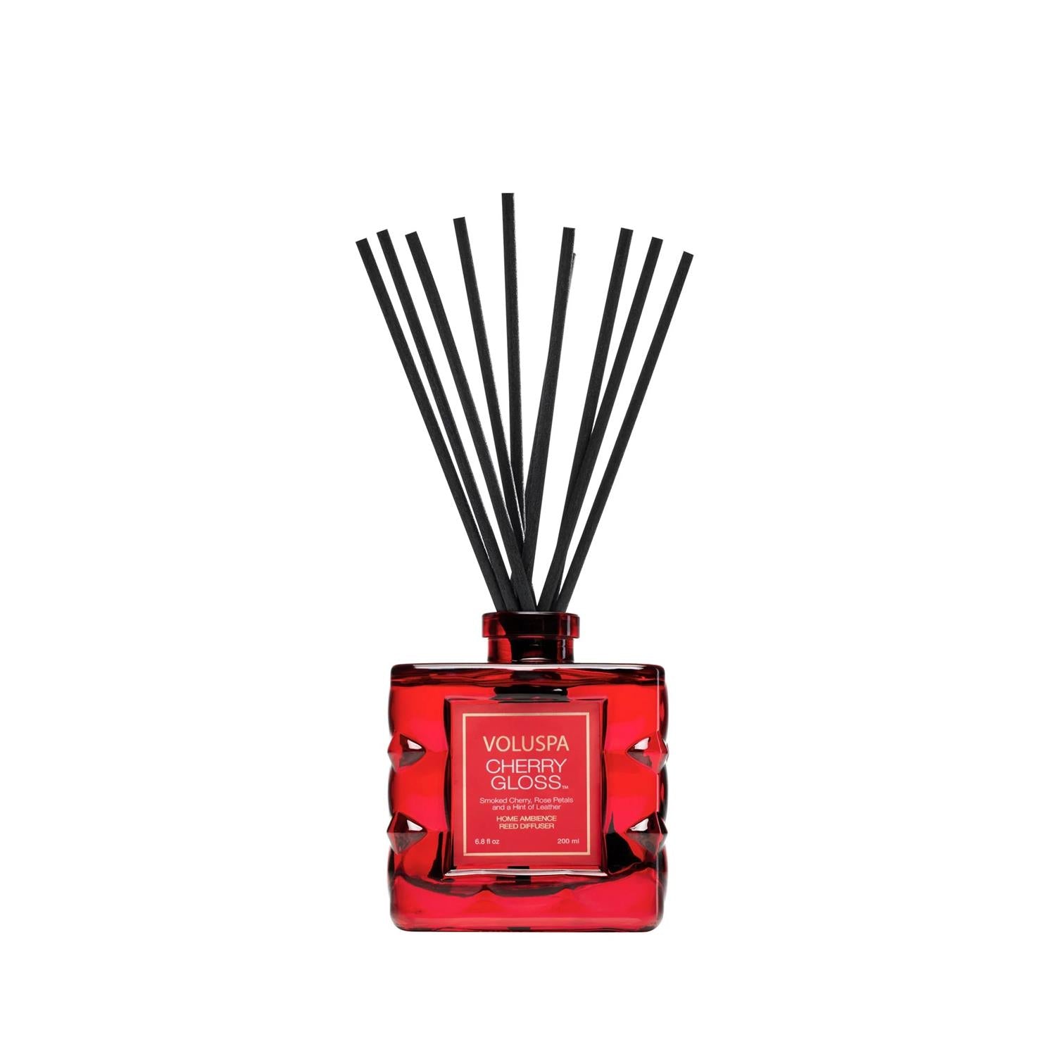 "Reed Diffuser 200ml Cherry Gloss" fra Voluspa. Duftpinner med deilig duft av røkt kirsebær og roseblader, kombinert med selvtilliten til Guaiac Wood og et hint av lær.
